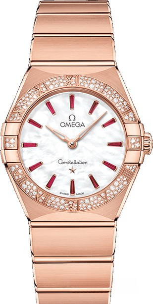 Характерными элементами выразительного и всегда актуального дизайна часов OMEGA Constellation являются узнаваемые полукруглые скосы вверху и внизу корпуса, боковые "скобки" и интегрированный браслет. Модель из 18-каратного золота Sedna™ имеет корпус диаметром 28 мм, белый перламутровый циферблат с рубиновыми часовыми индексами и устойчивое к царапинам сапфировое стекло. В часы установлен механизм OMEGA 4061, а их заднюю крышку украшает рельефный медальон с изображением обсерватории. Часы комплектуются браслетом из розового золота 18к. Безель из белых бриллиантов.