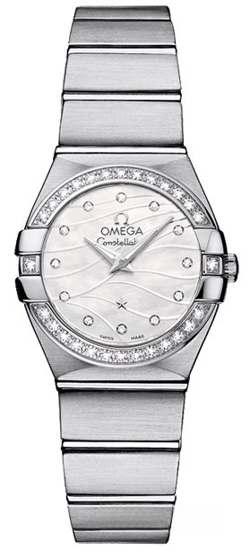 Необычайно эффектный дизайн часов OMEGA Constellation прошел проверку временем. Его характерной особенностью стали знаменитые скобки по бокам часового корпуса и впечатляющие циферблаты. Данная модель имеет гравированный белый перламутровый циферблат с узором из расходящихся от легендарных скобок волн. Циферблат насчитывает 12 бриллиантовых часовых меток. Украшенный бриллиантами безель закреплен на корпусе диаметром 24 мм из нержавеющей стали, который дополнен стальным браслетом. В часах используется кварцевый часовой механизм OMEGA, калибр 1376.
