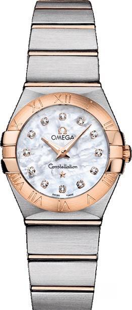 Необычайно эффектный дизайн часов OMEGA Constellation прошел проверку временем. Его характерной особенностью стали знаменитые скобки по бокам часового корпуса и впечатляющие циферблаты. Эта сатинированная модель имеет белый перламутровый циферблат с бриллиантовыми часовыми метками, который накрыт устойчивым к царапинам сапфировым стеклом. Безель из 18-каратного розового золота с выгравированными римскими цифрами закреплен на корпусе диаметром 24 мм из нержавеющей стали, который дополнен браслетом из нержавеющей стали и 18-каратного розового золота. В этих часах используется высокоточный кварцевый механизм OMEGA, калибр 1376.