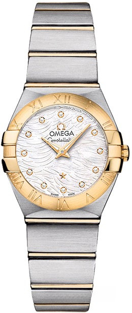 Необычайно эффектный дизайн часов OMEGA Constellation прошел проверку временем. Его характерной особенностью стали знаменитые скобки по бокам часового корпуса и уникальный циферблат. Эта модель имеет гравированный белый перламутровый циферблат с узором из волн. Циферблат насчитывает 12 бриллиантовых часовых меток. Безель из 18-каратного желтого золота с выгравированными римскими цифрами закреплен на корпусе диаметром 24 мм из нержавеющей стали, который дополнен стальным браслетом с соединительными элементами из 18-каратного золота. В часах используется кварцевый часовой механизм, калибр 1376.