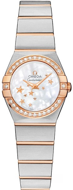 Необычайно эффектный дизайн часов OMEGA Constellation прошел проверку временем. Его характерной особенностью стали знаменитые скобки по бокам часового корпуса и впечатляющие циферблаты. Эта сатинированная модель имеет белый перламутровый циферблат с россыпью накладных позолоченных звезд, который накрыт устойчивым к царапинам сапфировым стеклом. Украшенный бриллиантами безель из 18-каратного розового золота закреплен на корпусе диаметром 24 мм из нержавеющей стали, который дополнен браслетом из нержавеющей стали и 18-каратного розового золота. В этих часах используется высокоточный кварцевый механизм OMEGA, калибр 1376.