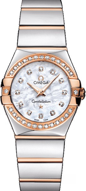 Необычайно эффектный дизайн часов OMEGA Constellation прошел проверку временем. Его характерной особенностью стали знаменитые скобки по бокам часового корпуса и впечатляющие циферблаты. Эта полированная модель имеет белый перламутровый циферблат с бриллиантовыми часовыми метками, который накрыт устойчивым к царапинам сапфировым стеклом. Украшенный бриллиантами безель из 18-каратного розового золота закреплен на корпусе диаметром 24 мм из нержавеющей стали, который дополнен браслетом из нержавеющей стали и 18-каратного розового золота. В этих часах используется высокоточный кварцевый механизм OMEGA, калибр 1376.