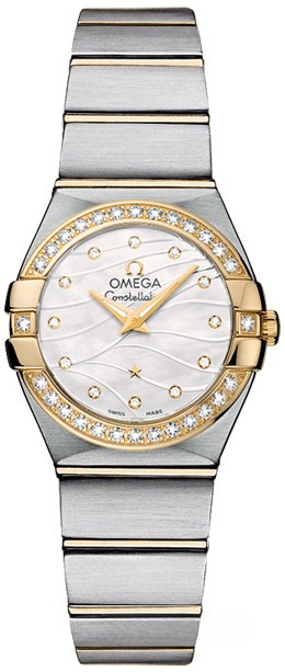 Необычайно эффектный дизайн часов OMEGA Constellation прошел проверку временем. Его характерной особенностью стали знаменитые скобки по бокам часового корпуса и впечатляющие циферблаты. Данная модель имеет гравированный белый перламутровый циферблат с узором из расходящихся от легендарных скобок волн. Циферблат насчитывает 12 бриллиантовых часовых меток. Украшенный бриллиантами безель из 18-каратного желтого золота закреплен на корпусе диаметром 24 мм из нержавеющей стали, который дополнен стальным браслетом с соединительными элементами из 18-каратного желтого золота. В часах используется кварцевый часовой механизм OMEGA, калибр 1376.