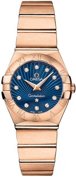 Необычайно эффектный дизайн часов OMEGA Constellation прошел проверку временем. Его характерной особенностью стали знаменитые скобки по бокам часового корпуса и впечатляющие циферблаты. Данная модель имеет синий циферблат с узором Supernova и 12 бриллиантовыми часовыми метками. Безель с выгравированными римскими цифрами закреплен на корпусе диаметром 24 мм из 18-каратного розового золота, который дополнен таким же золотым браслетом. В этих часах используется кварцевый часовой механизм OMEGA, калибр 1376.