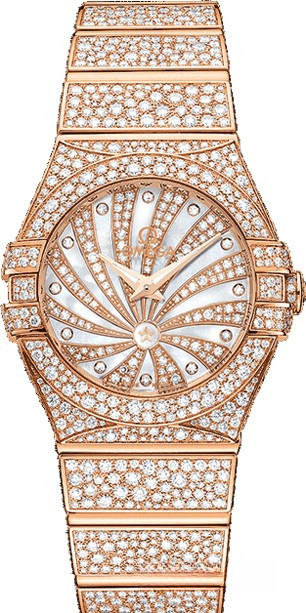 Необычайно эффектный дизайн часов OMEGA Constellation прошел проверку временем. Его характерной особенностью стали знаменитые скобки по бокам часового корпуса и впечатляющие циферблаты. Эта роскошная модель имеет украшенный бриллиантами циферблат из 18-каратного золота с белым перламутровым узором Supernova, накрытый устойчивым к царапинам сапфировым стеклом. Корпус диаметром 24 мм из 18-каратного розового золота с золотым безелем дополнен браслетом из 18-каратного розового золота. Безель, корпус и звенья браслета украшены паве из разноразмерных бриллиантов. В этих часах с 1762 бриллиантами используется высокоточный кварцевый механизм OMEGA, калибр 1376.