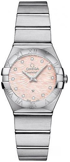 Необычайно эффектный дизайн часов OMEGA Constellation прошел проверку временем. Его характерной особенностью стали знаменитые скобки по бокам часового корпуса и уникальный циферблат. Эта модель имеет гравированный розовый перламутровый циферблат с узором из волн. Циферблат насчитывает 12 бриллиантовых часовых меток. Безель с выгравированными римскими цифрами закреплен на корпусе диаметром 24 мм из нержавеющей стали, который дополнен стальным браслетом. В часах используется кварцевый часовой механизм, калибр 1376.