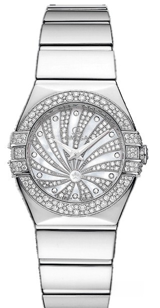 Необычайно эффектный дизайн часов OMEGA Constellation прошел проверку временем. Его характерной особенностью стали знаменитые скобки по бокам часового корпуса и впечатляющие циферблаты. Эта роскошная модель имеет украшенный бриллиантами циферблат из 18-каратного золота с белым перламутровым узором Supernova, накрытый устойчивым к царапинам сапфировым стеклом. Безель с паве из разноразмерных бриллиантов закреплен на корпусе диаметром 24 мм из 18-каратного белого золота. Часы дополняет браслет из 18-каратного белого золота. В этих часах с 281 бриллиантом используется высокоточный кварцевый механизм OMEGA, калибр 1376.