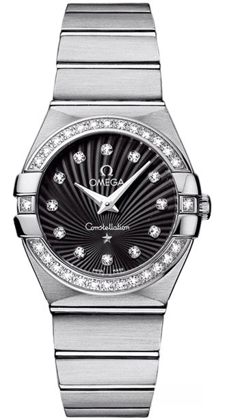 Необычайно эффектный дизайн часов OMEGA Constellation прошел проверку временем. Его характерной особенностью стали знаменитые скобки по бокам часового корпуса и впечатляющие циферблаты. Эта сатинированная модель имеет черный циферблат с узором Supernova и бриллиантовыми часовыми метками, который накрыт устойчивым к царапинам сапфировым стеклом. Украшенный бриллиантами безель закреплен на корпусе диаметром 27 мм из нержавеющей стали, который дополнен стальным браслетом. В этих часах используется высокоточный кварцевый механизм OMEGA, калибр 1376.