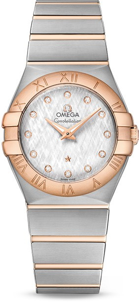 Необычайно эффектный дизайн часов OMEGA Constellation прошел проверку временем. Его характерной особенностью стали знаменитые скобки по бокам часового корпуса и впечатляющие циферблаты. Данная модель имеет серебристый циферблат. Циферблат насчитывает 12 бриллиантовых часовых меток. Безель из 18-каратного розового золота с выгравированными римскими цифрами закреплен на корпусе диаметром 27 мм из нержавеющей стали, который дополнен стальным браслетом с соединительными элементами из 18-каратного розового золота. В часах используется кварцевый часовой механизм OMEGA, калибр 1376.
