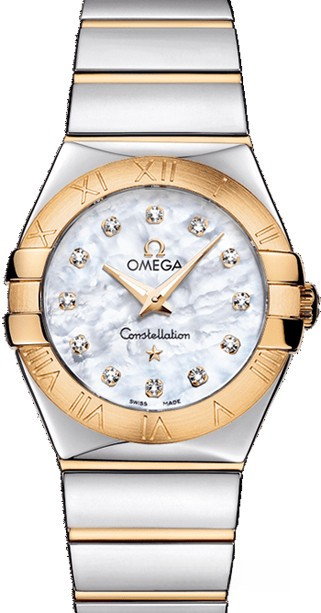 Необычайно эффектный дизайн часов OMEGA Constellation прошел проверку временем. Его характерной особенностью стали знаменитые скобки по бокам часового корпуса и впечатляющие циферблаты. Эта полированная модель имеет белый перламутровый циферблат с бриллиантовыми часовыми метками, который накрыт устойчивым к царапинам сапфировым стеклом. Безель из 18-каратного желтого золота с выгравированными римскими цифрами закреплен на корпусе диаметром 27 мм из нержавеющей стали, который дополнен браслетом из нержавеющей стали и 18-каратного желтого золота. В этих часах используется высокоточный кварцевый механизм OMEGA, калибр 1376.