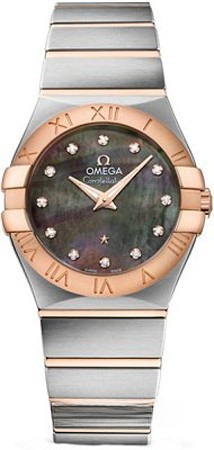Названная в честь небесных светил коллекция Constellation с 1952 года является символом роскоши. При создании этой серии мастера OMEGA обратились не только к темам неба, но и морских глубин: циферблаты часов изготовлены из перламутра с острова Таити. Циферблат модели диаметром 27 мм украшен 12 бриллиантовыми часовыми метками в оправе из 18-каратного розового золота, которая идеально сочетается с полированными гранеными стрелками. Корпус и браслет изготовлены из нержавеющей стали и 18-каратного розового золота. Ставшие характерной особенностью коллекции Constellation знаменитые скобки расположены на безеле с римскими цифрами в тон. В модели используется кварцевый часовой механизм OMEGA, калибр 1376. Матовая задняя крышка корпуса украшена рельефным медальоном с изображением обсерватории.