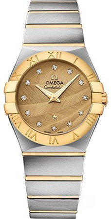 Необычайно эффектный дизайн часов OMEGA Constellation прошел проверку временем. Его характерной особенностью стали знаменитые скобы по бокам часового корпуса и уникальный циферблат. Эта модель имеет матовый лаковый циферблат цвета шампанского с перистым узором между легендарными скобами. Циферблат насчитывает 12 бриллиантовых часовых меток. Безель из 18-каратного желтого золота с выгравированными римскими цифрами закреплен на корпусе диаметром 27 мм из нержавеющей стали, который дополнен браслетом из нержавеющей стали и 18-каратного желтого золота. В часах используется кварцевый часовой механизм, калибр 1376.