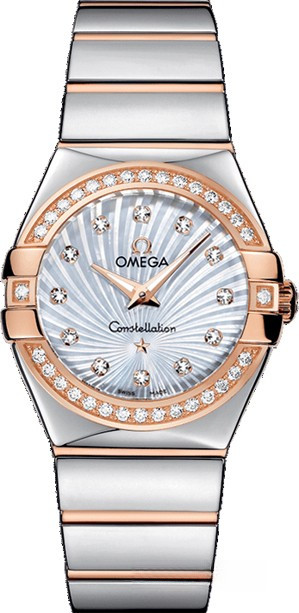 Необычайно эффектный дизайн часов OMEGA Constellation прошел проверку временем. Его характерной особенностью стали знаменитые скобки по бокам часового корпуса и впечатляющие циферблаты. Эта полированная модель имеет белый перламутровый циферблат с узором Supernova и бриллиантовыми часовыми метками, который накрыт устойчивым к царапинам сапфировым стеклом. Украшенный бриллиантами безель из 18-каратного розового золота закреплен на корпусе диаметром 27 мм из нержавеющей стали, который дополнен браслетом из нержавеющей стали и 18-каратного розового золота. В этих часах используется высокоточный кварцевый механизм OMEGA, калибр 1376.