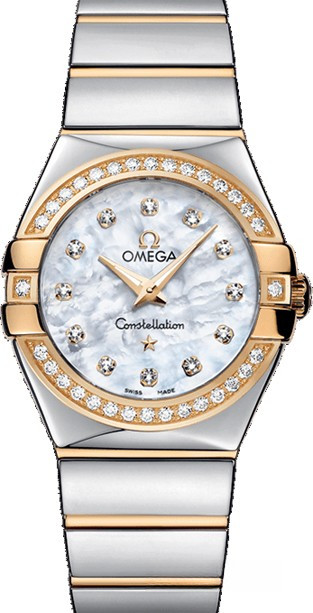 Необычайно эффектный дизайн часов OMEGA Constellation прошел проверку временем. Его характерной особенностью стали знаменитые скобки по бокам часового корпуса и впечатляющие циферблаты. Эта полированная модель имеет белый перламутровый циферблат с бриллиантовыми часовыми метками, который накрыт устойчивым к царапинам сапфировым стеклом. Украшенный бриллиантами безель из 18-каратного желтого золота закреплен на корпусе диаметром 27 мм из нержавеющей стали, который дополнен браслетом из нержавеющей стали и 18-каратного желтого золота. В этих часах используется высокоточный кварцевый механизм OMEGA, калибр 1376.