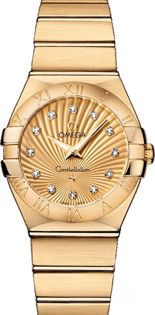 Необычайно эффектный дизайн часов OMEGA Constellation прошел проверку временем. Его характерной особенностью стали знаменитые скобки по бокам часового корпуса и впечатляющие циферблаты. Эта сатинированная модель имеет циферблат цвета шампанского с узором Supernova и бриллиантовыми часовыми метками, который накрыт устойчивым к царапинам сапфировым стеклом. Безель с выгравированными римскими цифрами закреплен на корпусе диаметром 27 мм из 18-каратного желтого золота. Часы дополняет браслет из 18-каратного желтого золота. В этих часах используется высокоточный кварцевый механизм OMEGA, калибр 1376.