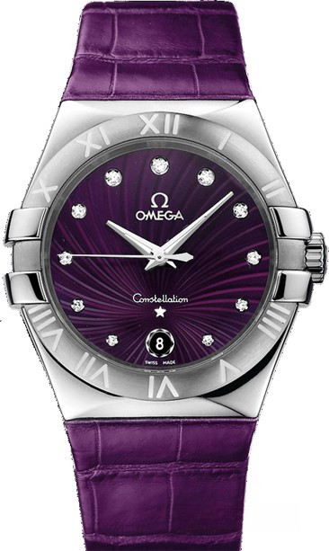 Необычайно эффектный дизайн часов OMEGA Constellation прошел проверку временем. Его характерной особенностью стали знаменитые скобки по бокам часового корпуса и впечатляющие циферблаты. Эта модель имеет фиолетовый циферблат с узором Supernova, окошком указателя даты в положении "6 часов", бриллиантовыми часовыми метками и устойчивым к царапинам сапфировым стеклом. Безель с выгравированными римскими цифрами закреплен на корпусе диаметром 35 мм из нержавеющей стали. Часы дополняет фиолетовый кожаный ремешок. В этих часах используется высокоточный кварцевый механизм OMEGA, калибр 1532.