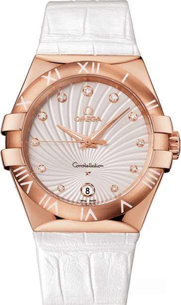 Необычайно эффектный дизайн часов OMEGA Constellation прошел проверку временем. Его характерной особенностью стали знаменитые скобки по бокам часового корпуса и впечатляющие циферблаты. Эта модель имеет белый циферблат с узором Supernova, окошком указателя даты в положении «6 часов», бриллиантовыми часовыми метками и устойчивым к царапинам сапфировым стеклом. Безель с выгравированными римскими цифрами закреплен на корпусе диаметром 35 мм из 18-каратного розового золота. Часы дополняет белый кожаный ремешок. В этих часах используется высокоточный кварцевый механизм OMEGA, калибр 1532.