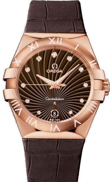 Необычайно эффектный дизайн часов OMEGA Constellation прошел проверку временем. Его характерной особенностью стали знаменитые скобки по бокам часового корпуса и впечатляющие циферблаты. Эта модель имеет коричневый циферблат с узором Supernova, окошком указателя даты в положении "6 часов", бриллиантовыми часовыми метками и устойчивым к царапинам сапфировым стеклом. Безель с выгравированными римскими цифрами закреплен на корпусе диаметром 35 мм из 18-каратного розового золота. Часы дополняет коричневый кожаный ремешок. В этих часах используется высокоточный кварцевый механизм OMEGA, калибр 1532.