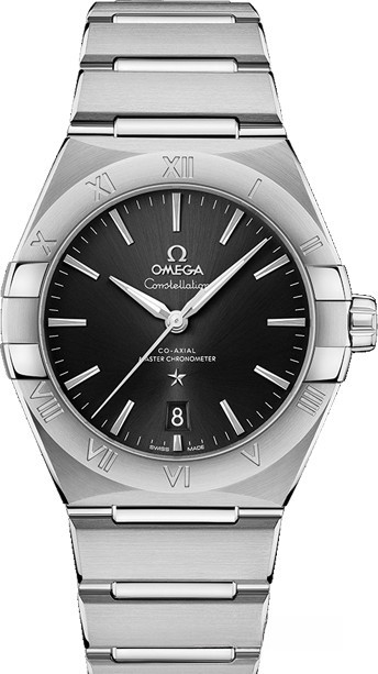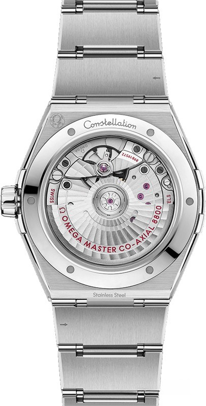 Характерными элементами выразительного и всегда актуального дизайна часов OMEGA Constellation являются узнаваемые полукруглые скосы вверху и внизу корпуса, боковые "скобки" и интегрированный браслет. Модель из нержавеющей стали имеет корпус диаметром 39 мм, безель с выгравированными римскими цифрами, черный циферблат с радиальным сатинированием и окошком указателя даты в положении "6 часов". Стрелки, логотип OMEGA, звезда Constellation и индексы выполнены из 18-каратного белого золота. Часы оснащены калибром OMEGA Co-Axial Master Chronometer 8800, который можно рассмотреть сквозь устойчивое к царапинам выпуклое сапфировое стекло задней крышки корпуса.