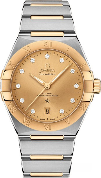 Характерными элементами выразительного и всегда актуального дизайна часов OMEGA Constellation являются узнаваемые полукруглые скосы вверху и внизу корпуса, боковые "скобки" и интегрированный браслет. Модель из нержавеющей стали и 18-каратного желтого золота имеет корпус диаметром 39 мм, безель с выгравированными римскими цифрами, циферблат цвета шампанского с радиальным сатинированием, бриллиантовыми индексами и окошком указателя даты в положении "6 часов". Стрелки, логотип OMEGA, звезда Constellation и оправа бриллиантов также выполнены из 18-каратного желтого золота. Часы оснащены калибром OMEGA Co-Axial Master Chronometer 8800, который можно рассмотреть сквозь устойчивое к царапинам выпуклое сапфировое стекло задней крышки корпуса.
