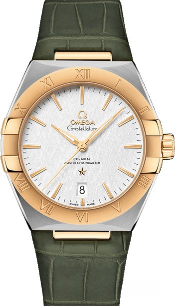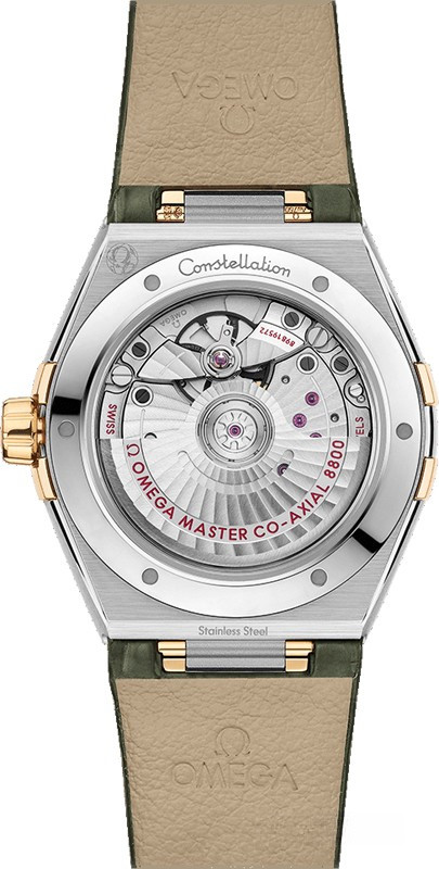 Характерными элементами выразительного и всегда актуального дизайна часов OMEGA Constellation являются узнаваемые полукруглые скосы вверху и внизу корпуса, а также боковые "скобки". Модель из нержавеющей стали и 18-каратного желтого золота имеет корпус диаметром 39 мм, безель с выгравированными римскими цифрами, серебристо-белый циферблат с рельефным узором и шелковистой текстурой и окошком указателя даты в положении "6 часов". Стрелки, логотип OMEGA, звезда Constellation и индексы также выполнены из 18-каратного желтого золота. Часы с кожаным ремешком оливкового цвета оснащены калибром OMEGA Co-Axial Master Chronometer 8800, который можно рассмотреть сквозь устойчивое к царапинам выпуклое сапфировое стекло задней крышки корпуса.