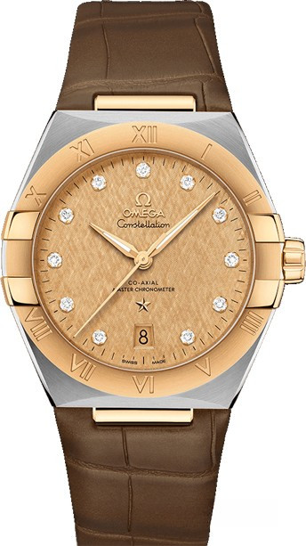 Характерными элементами выразительного и всегда актуального дизайна часов OMEGA Constellation являются узнаваемые полукруглые скосы вверху и внизу корпуса, а также боковые "скобки". Модель из нержавеющей стали и 18-каратного желтого золота имеет корпус диаметром 39 мм, безель с выгравированными римскими цифрами, циферблат цвета шампанского с рельефным узором и шелковистой текстурой, с бриллиантовыми индексами и окошком указателя даты в положении "6 часов". Стрелки, логотип OMEGA, звезда Constellation и оправа бриллиантов также выполнены из 18-каратного желтого золота. Часы с коричневым кожаным ремешком оснащены калибром OMEGA Co-Axial Master Chronometer 8800, который можно рассмотреть сквозь устойчивое к царапинам выпуклое сапфировое стекло задней крышки корпуса.