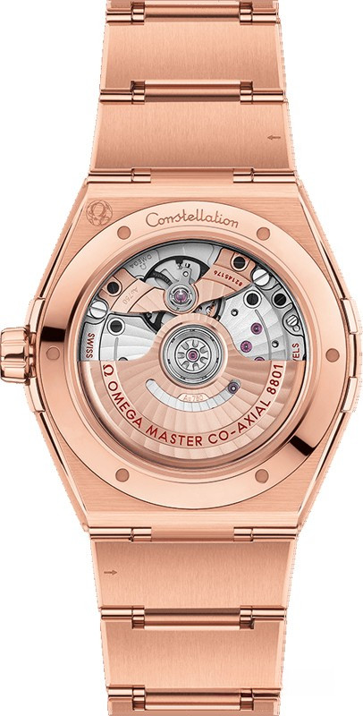 Характерными элементами выразительного и всегда актуального дизайна часов OMEGA Constellation являются узнаваемые полукруглые скосы вверху и внизу корпуса, боковые "скобки" и интегрированный браслет. Модель из 18-каратного золота Sedna™ имеет корпус диаметром 39 мм, безель с выгравированными римскими цифрами, опаловый серебристо-белый циферблат с окошком указателя даты в положении "6 часов". Стрелки, логотип OMEGA, звезда Constellation и индексы также выполнены из 18-каратного золота Sedna™. Часы оснащены калибром OMEGA Co-Axial Master Chronometer 8801, который можно рассмотреть сквозь устойчивое к царапинам выпуклое сапфировое стекло задней крышки корпуса.