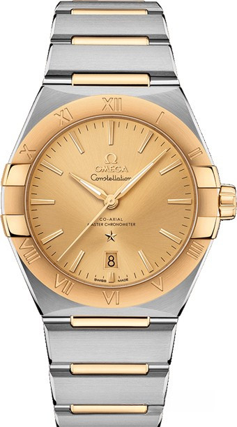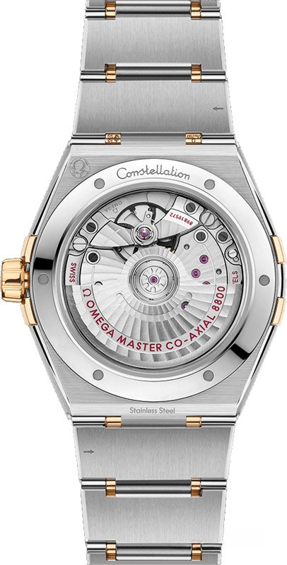 Характерными элементами выразительного и всегда актуального дизайна часов OMEGA Constellation являются узнаваемые полукруглые скосы вверху и внизу корпуса, боковые "скобки" и интегрированный браслет. Модель из нержавеющей стали и 18-каратного желтого золота имеет корпус диаметром 39 мм, безель с выгравированными римскими цифрами, опаловый серебристо-белый циферблат с окошком указателя даты в положении "6 часов". Стрелки, логотип OMEGA, звезда Constellation и индексы также выполнены из 18-каратного желтого золота. Часы оснащены калибром OMEGA Co-Axial Master Chronometer 8800, который можно рассмотреть сквозь устойчивое к царапинам выпуклое сапфировое стекло задней крышки корпуса.