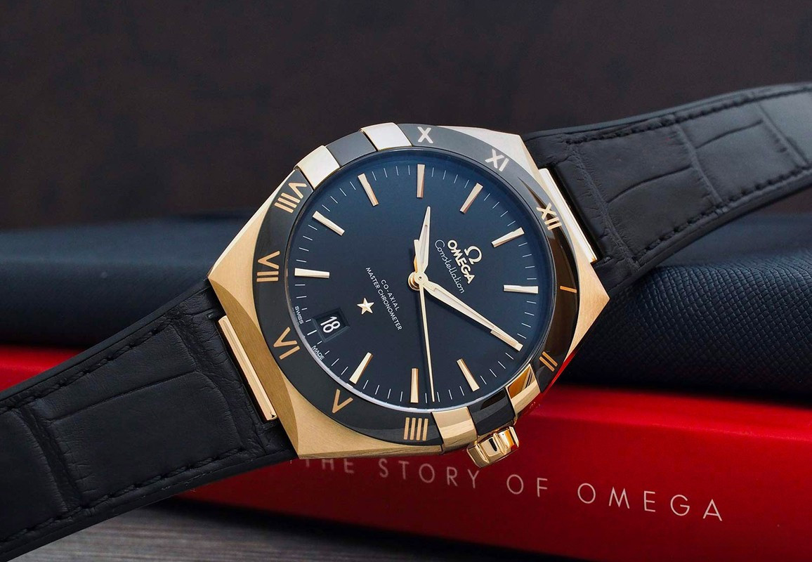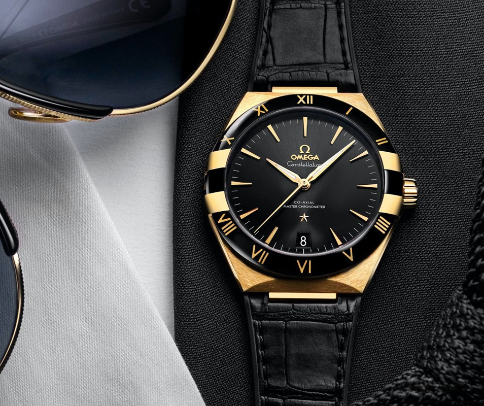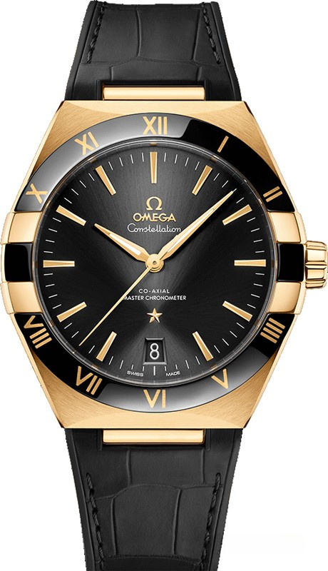 Характерными элементами выразительного и всегда актуального дизайна часов Omega Constellation являются узнаваемые полукруглые скосы вверху и внизу корпуса, а также боковые "скобки". Модель из желтого золота 18к имеет корпус диаметром 41 мм, безель с римскими цифрами, циферблат черного цвета, с шелковистой текстурой и окошком указателя даты в положении "6 часов". Стрелки, логотип Omega, звезда Constellation и граненые индексы выполнены в золотистом цвете. Часы с ремешком из кожи аллигатора оснащены калибром Omega Co-Axial Master Chronometer 8900, который можно рассмотреть сквозь устойчивое к царапинам выпуклое сапфировое стекло задней крышки корпуса.