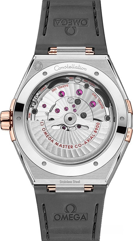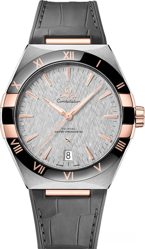 Характерными элементами выразительного и всегда актуального дизайна часов Omega Constellation являются узнаваемые полукруглые скосы вверху и внизу корпуса, а также боковые "скобки". Модель из нержавеющей стали и розового золота 18к имеет корпус диаметром 41 мм, безель с римскими цифрами, циферблат серого цвета, с шелковистой текстурой и окошком указателя даты в положении "6 часов". Стрелки, логотип Omega, звезда Constellation и граненые индексы выполнены в золотистом цвете. Часы с ремешком из кожи аллигатора оснащены калибром Omega Co-Axial Master Chronometer 8900, который можно рассмотреть сквозь устойчивое к царапинам выпуклое сапфировое стекло задней крышки корпуса.