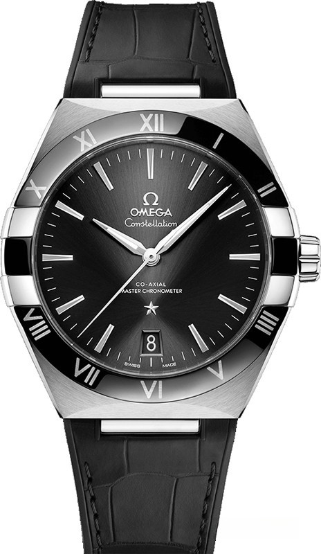 Характерными элементами выразительного и всегда актуального дизайна часов Omega Constellation являются узнаваемые полукруглые скосы вверху и внизу корпуса, а также боковые "скобки". Модель из нержавеющей стали имеет корпус диаметром 41 мм, безель с римскими цифрами, циферблат черного цвета, с шелковистой текстурой и окошком указателя даты в положении "6 часов". Стрелки, логотип Omega, звезда Constellation и граненые индексы выполнены в серебристом цвете. Часы с ремешком из кожи аллигатора оснащены калибром Omega Co-Axial Master Chronometer 8900, который можно рассмотреть сквозь устойчивое к царапинам выпуклое сапфировое стекло задней крышки корпуса.