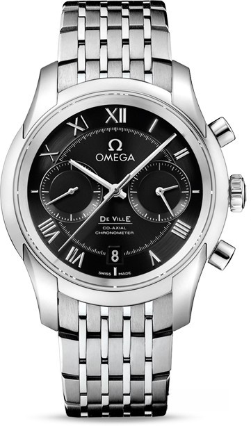 Элегантные часы OMEGA De Ville характеризуются уникальным классическим дизайном. Этот хронограф имеет черный циферблат с делением на две зоны , римскими цифрами, окошком указателя даты в положении «6 часов» и устойчивым к царапинам сапфировым стеклом. На циферблате присутствуют отдельный индикатор малой секундной стрелки, а также 60-минутный и 12-часовой счетчики, размещенные на одном индикаторе для более удобного считывания результатов хронометража. Корпус диаметром 42 мм из нержавеющей стали с браслетом из нержавеющей стали дополнен элегантным безелем. В этой изысканной модели используется коаксиальный механизм OMEGA, калибр 9300, который виден сквозь прозрачную заднюю крышку корпуса.