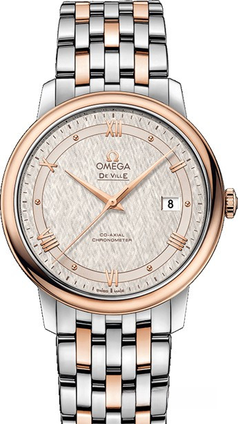 Коллекция Omega De Ville Prestige завоевала любовь поклонников бренда своим классическим элегантным дизайном. Входящие в нее модели отличаются чистотой линий, роскошной отделкой и вневременным дизайном. Эффектный серебристый гильошированный циферблат с окошком указателя даты в положении «6 часов» защищен устойчивым к царапинам сапфировым стеклом. Корпус диаметром 39,5 мм из нержавеющей стали и розового золота 18к дополнен браслетом из нержавеющей стали и розового золота 18к. Основу этой модели составляет коаксиальный Калибр 2500.
