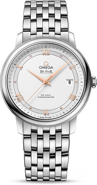 Коллекция Omega De Ville Prestige завоевала любовь поклонников бренда своим классическим элегантным дизайном. Входящие в нее модели отличаются чистотой линий, роскошной отделкой и вневременным дизайном. Эффектный белый циферблат с окошком указателя даты в положении «3 часа» защищен устойчивым к царапинам сапфировым стеклом. Корпус диаметром 39,5 мм из нержавеющей стали дополнен браслетом из нержавеющей стали. Основу этой модели составляет коаксиальный Калибр 2500.
