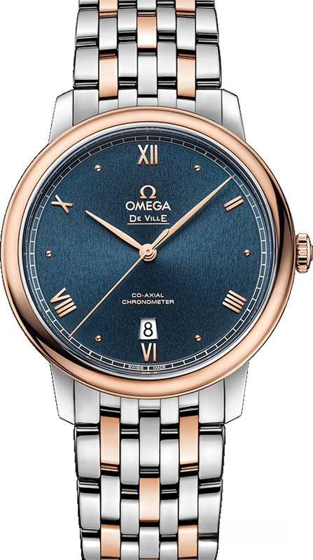 Коллекция Omega De Ville Prestige завоевала любовь поклонников бренда своим классическим элегантным дизайном. Входящие в нее модели отличаются чистотой линий, роскошной отделкой и вневременным дизайном. Эффектный синий циферблат с окошком указателя даты в положении «6 часов» защищен устойчивым к царапинам сапфировым стеклом. Корпус диаметром 39,5 мм из нержавеющей стали и розового золота 18к дополнен браслетом из нержавеющей стали и розового золота 18к. Основу этой модели составляет коаксиальный Калибр 2500.