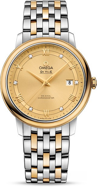 Коллекция Omega De Ville Prestige завоевала любовь поклонников бренда своим классическим элегантным дизайном. Входящие в нее модели отличаются чистотой линий, роскошной отделкой и вневременным дизайном. Эффектный золотистый циферблат с 6-ю белыми бриллиантами и окошком указателя даты в положении «3 часа» защищен устойчивым к царапинам сапфировым стеклом. Корпус диаметром 39,5 мм из нержавеющей стали и желтого золота 18к дополнен браслетом из нержавеющей стали и желтого золота 18к. Основу этой модели составляет коаксиальный Калибр 2500.