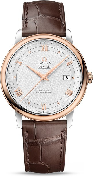 Коллекция Omega De Ville Prestige завоевала любовь поклонников бренда своим классическим элегантным дизайном. Входящие в нее модели отличаются чистотой линий, роскошной отделкой и вневременным дизайном. Эффектный серый циферблат с окошком указателя даты в положении «3 часа» защищен устойчивым к царапинам сапфировым стеклом. Корпус диаметром 39,5 мм из нержавеющей стали и розового золота 18к дополнен ремешком из кожи аллигатора с вставкой из нержавеющей стали. Основу этой модели составляет коаксиальный Калибр 2500.