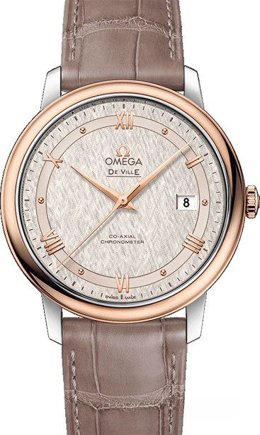 Коллекция Omega De Ville Prestige завоевала любовь поклонников бренда своим классическим элегантным дизайном. Входящие в нее модели отличаются чистотой линий, роскошной отделкой и вневременным дизайном. Эффектный серебристый гильошированный циферблат с окошком указателя даты в положении «6 часов» защищен устойчивым к царапинам сапфировым стеклом. Корпус диаметром 39,5 мм из нержавеющей стали и розового золота 18к дополнен ремешком из кожи аллигатора с вставкой из нержавеющей стали. Основу этой модели составляет коаксиальный Калибр 2500.