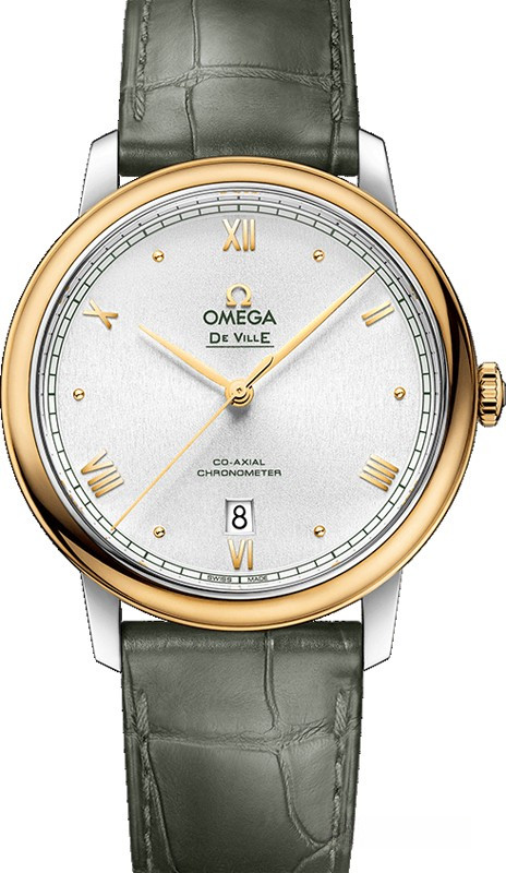 Коллекция Omega De Ville Prestige завоевала любовь поклонников бренда своим классическим элегантным дизайном. Входящие в нее модели отличаются чистотой линий, роскошной отделкой и вневременным дизайном. Эффектный серебристый циферблат с окошком указателя даты в положении «6 часов» защищен устойчивым к царапинам сапфировым стеклом. Корпус диаметром 39,5 мм из нержавеющей стали и желтого золота 18к дополнен ремешком из кожи аллигатора с вставкой из нержавеющей стали. Основу этой модели составляет коаксиальный Калибр 2500.