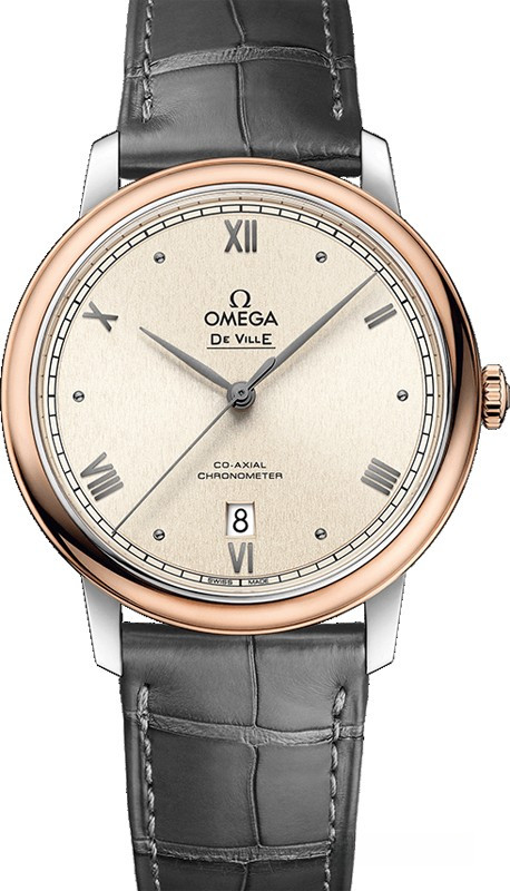 Коллекция Omega De Ville Prestige завоевала любовь поклонников бренда своим классическим элегантным дизайном. Входящие в нее модели отличаются чистотой линий, роскошной отделкой и вневременным дизайном. Эффектный серебристый циферблат с окошком указателя даты в положении «6 часов» защищен устойчивым к царапинам сапфировым стеклом. Корпус диаметром 39,5 мм из нержавеющей стали и розового золота 18к дополнен ремешком из кожи аллигатора с вставкой из нержавеющей стали. Основу этой модели составляет коаксиальный Калибр 2500.