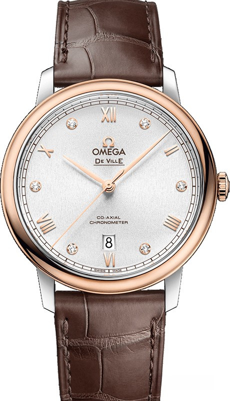 Коллекция Omega De Ville Prestige завоевала любовь поклонников бренда своим классическим элегантным дизайном. Входящие в нее модели отличаются чистотой линий, роскошной отделкой и вневременным дизайном. Эффектный серебристый циферблат с 6-ю белыми бриллиантами с окошком указателя даты в положении «6 часов» защищен устойчивым к царапинам сапфировым стеклом. Корпус диаметром 39,5 мм из нержавеющей стали и розового золота 18к дополнен ремешком из кожи аллигатора с вставкой из нержавеющей стали. Основу этой модели составляет коаксиальный Калибр 2500.