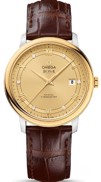 Коллекция OMEGA De Ville Prestige завоевала любовь поклонников бренда своим классическим элегантным дизайном. Входящие в нее модели отличаются чистотой классических линий, роскошной отделкой и вневременной эстетикой. У данной модели на циферблате цвета шампанского с радиальным сатинированием расположена часовая шкала с круговым сатинированием и часовые метки в виде полированных римских цифр и бриллиантовых индексов. Этот эффектный циферблат с окошком указателя даты в положении "3 часа" защищен устойчивым к царапинам сапфировым стеклом. Безель из 18-каратного желтого золота закреплен на корпусе диаметром 39,5 мм из нержавеющей стали с коричневым кожаным ремешком. Основу этой модели составляет коаксиальный калибр 2500.