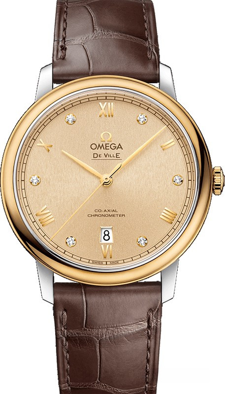 Коллекция Omega De Ville Prestige завоевала любовь поклонников бренда своим классическим элегантным дизайном. Входящие в нее модели отличаются чистотой линий, роскошной отделкой и вневременным дизайном. Эффектный золотистый циферблат с 6-ю белыми бриллиантами с окошком указателя даты в положении «6 часов» защищен устойчивым к царапинам сапфировым стеклом. Корпус диаметром 39,5 мм из нержавеющей стали и желтого золота 18к дополнен ремешком из кожи аллигатора с вставкой из нержавеющей стали. Основу этой модели составляет коаксиальный Калибр 2500.