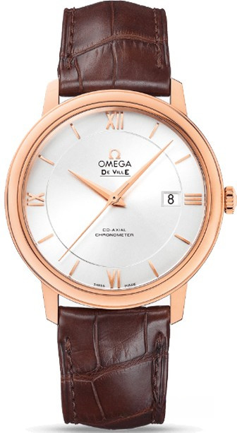 Коллекция OMEGA De Ville Prestige завоевала любовь поклонников бренда своим классическим элегантным дизайном. Входящие в нее модели отличаются чистотой линий, роскошной отделкой и вневременным дизайном. Данная модель имеет серебристый циферблат с делением на две зоны и выполненными из золота римскими цифрами в положениях «3 часа», «6 часов», «9 часов» и «12 часов». Эффектный циферблат с окошком указателя даты в положении «3 часа» защищен устойчивым к царапинам сапфировым стеклом. Корпус диаметром 39,5 мм из 18-каратного красного золота с коричневым кожаным ремешком дополнен элегантным безелем. Основу этой модели составляет коаксиальный калибр 2500.