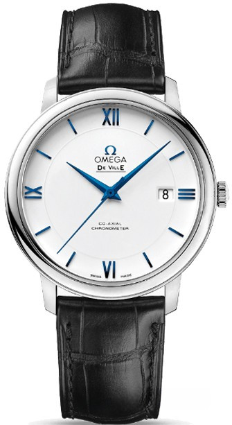 Коллекция OMEGA De Ville Prestige завоевала любовь поклонников бренда своим классическим элегантным дизайном. Входящие в нее модели отличаются чистотой линий, роскошной отделкой и вневременным дизайном. Данная модель имеет белый циферблат с делением на две зоны, с окошком указателя даты в положении «3 часа». Часовые метки и центральные часовая, минутная и секундная стрелки имеют синее PVD-покрытие. Эффектный циферблат защищен устойчивым к царапинам сапфировым стеклом. Корпус диаметром 39,5 мм из 18-каратного белого золота с черным кожаным ремешком дополнен элегантным безелем. Основу этой модели составляет коаксиальный калибр 2500.