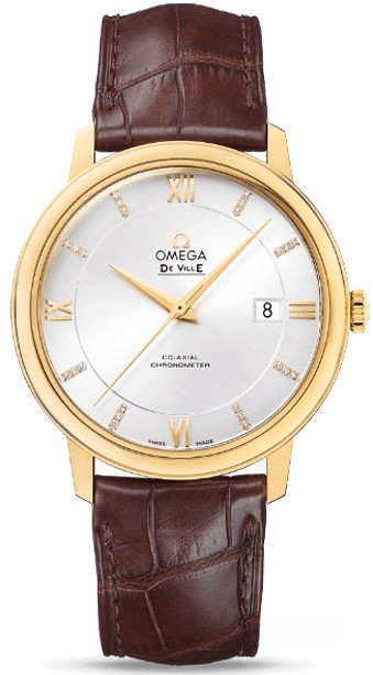 Коллекция OMEGA De Ville Prestige завоевала любовь поклонников бренда своим классическим элегантным дизайном. Входящие в нее модели отличаются чистотой линий, роскошной отделкой и вневременным дизайном. Данная модель имеет серебристый циферблат с делением на две зоны, бриллиантовыми часовыми метками и выполненными из золота римскими цифрами в положениях «3 часа», «6 часов», «9 часов» и «12 часов». Эффектный циферблат с окошком указателя даты в положении «3 часа» защищен устойчивым к царапинам сапфировым стеклом. Корпус диаметром 39,5 мм из 18-каратного желтого золота с коричневым кожаным ремешком дополнен элегантным безелем. Основу этой модели составляет коаксиальный калибр 2500.