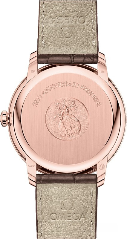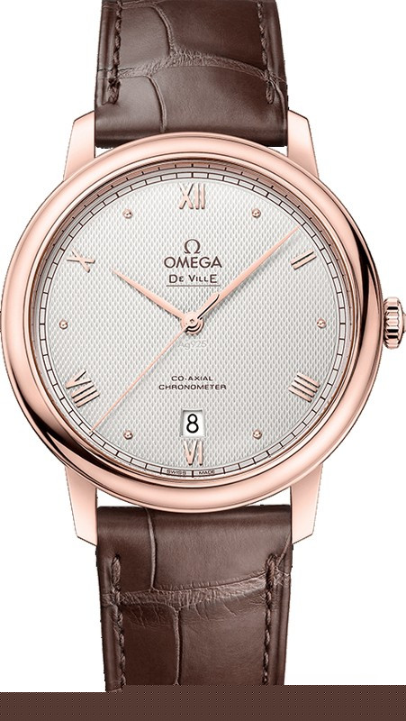 Коллекция Omega De Ville Prestige завоевала любовь поклонников бренда своим классическим элегантным дизайном. Входящие в нее модели отличаются чистотой линий, роскошной отделкой и вневременным дизайном. Эффектный серебристый гильошированный циферблат с окошком указателя даты в положении «6 часов» защищен устойчивым к царапинам сапфировым стеклом. Корпус диаметром 39,5 мм из розового золота 18к дополнен ремешкомиз кожи аллигатора с вставкой из розового золота 18к. Основу этой модели составляет коаксиальный Калибр 2500.
