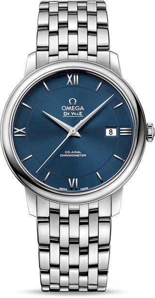 Коллекция Omega De Ville Prestige завоевала любовь поклонников бренда своим классическим элегантным дизайном. Входящие в нее модели отличаются чистотой линий, роскошной отделкой и вневременным дизайном. Эффектный синий циферблат с окошком указателя даты в положении «3 часа» защищен устойчивым к царапинам сапфировым стеклом. Корпус диаметром 39,5 мм из нержавеющей стали дополнен браслетом из нержавеющей стали. Основу этой модели составляет коаксиальный Калибр 2500.