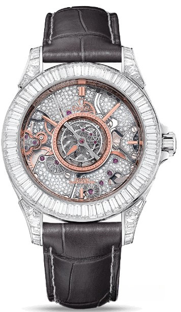 Каждый экземпляр OMEGA De Ville Tourbillon – это уникальные часы ручной работы, сочетающие в себе удивительную красоту с революционными инновациями, и изысканный образец часового искусства. В часах использован эксклюзивный часовой механизм OMEGA с центральным турбийоном, который устраняет влияние сил земного тяготения. Эти часы выпускаются всего в трех экземплярах. Циферблат из устойчивого к царапинам сапфирового стекла открывает захватывающий вид на работающий внутри механизм. Секундная стрелка из 18-каратного розового золота закреплена прямо на каретке турбийона. Корпус диаметром 38,7 мм из платины 950-й пробы полностью покрыт 170 бриллиантами огранки "багет", а часовой механизм украшен 289 бриллиантами единичной огранки. Часы предлагаются с серым кожаным ремешком с платиновой строчкой. В этом замечательном творении часовщиков использован коаксиальный часовой механизм OMEGA, калибр 2637, с инерционным сектором из платины 950-й пробы. На мосте турбийона, с задней стороны, выгравированы инициалы часового мастера.