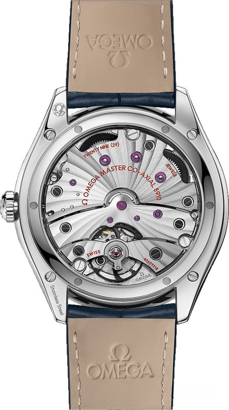 Omega представила элегантную трехстрелочную модель De Ville Trésor 40 мм. Часы обладают 40-миллиметровым корпусом из нержавеющей стали. Циферблат синего цвета. На задней крышке часов расположено сапфировое стекло, открывающее вид на механизм с ручным заводом. Внутри корпуса находится Калибр 8910, самый первый хронометр с ручным заводом и сертификатом METAS от Omega. Естественно, с коаксиальным спуском. Часы поставляются на ремешке из кожи аллигатора с вставкой из нержавеющей стали.